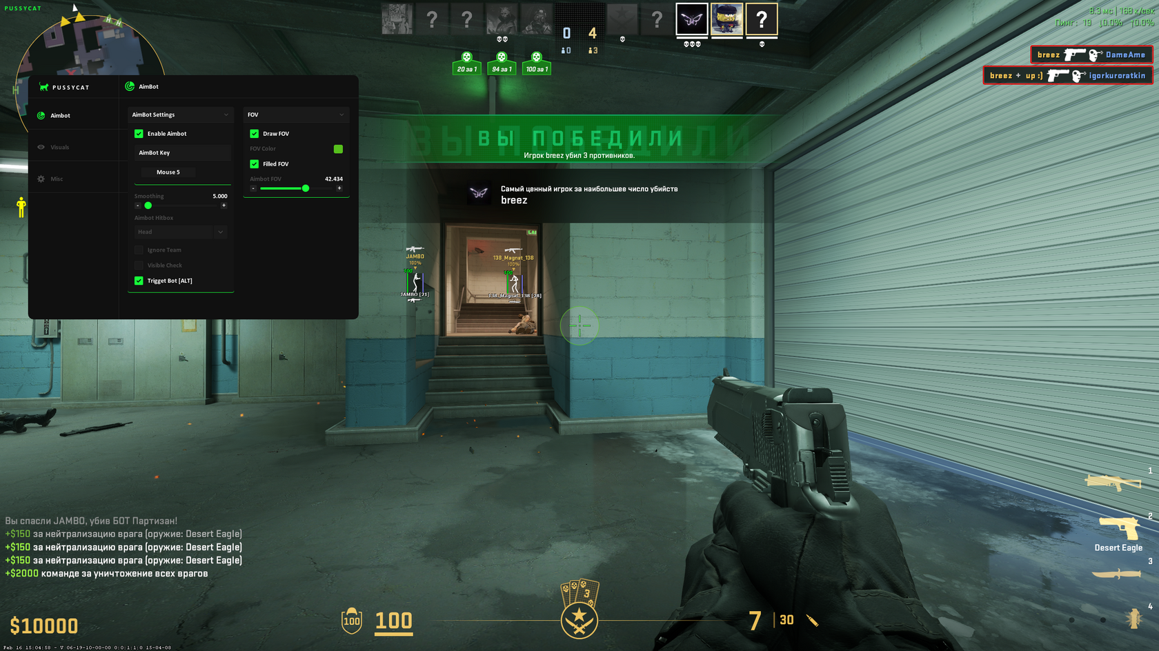 Чит для Counter Strike 2 от разработчиков Pussy Cat использует передовые технологии для улучшения игрового процесса, обеспечивая стабильную работу и надежную защиту от обнаружения.