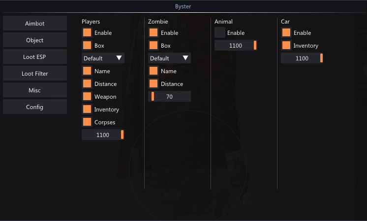 • ESP на игроков, аномалии на сталкер серверах (Other), предметы в инвентаре игроков, расстояние, скелет, ники игроков, оружие, ESP зомби, ESP животные, ESP авто, HP bar players/zombi, детали машин, дистанция зомби, ползунок расстояния до игрока, ползунок расстояния до зомби, ползунок расстояния до автомобиля, ползунок расстояния до животных, трупы, города, отображения военнок и городов