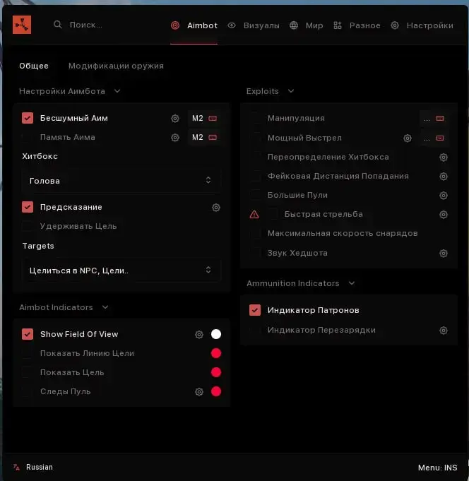 • Включить аимбот, игнорировать союзников, тип аимбота - невидимая наводка, наводка через мышку, кость - ближайшая, голова, грудная клетка, таз, игнорировать спящих, проверка видимости, радиус обзора для захвата, время реакции аимбота, задержка после выстрела - 1-100, дистанция срабатывания
